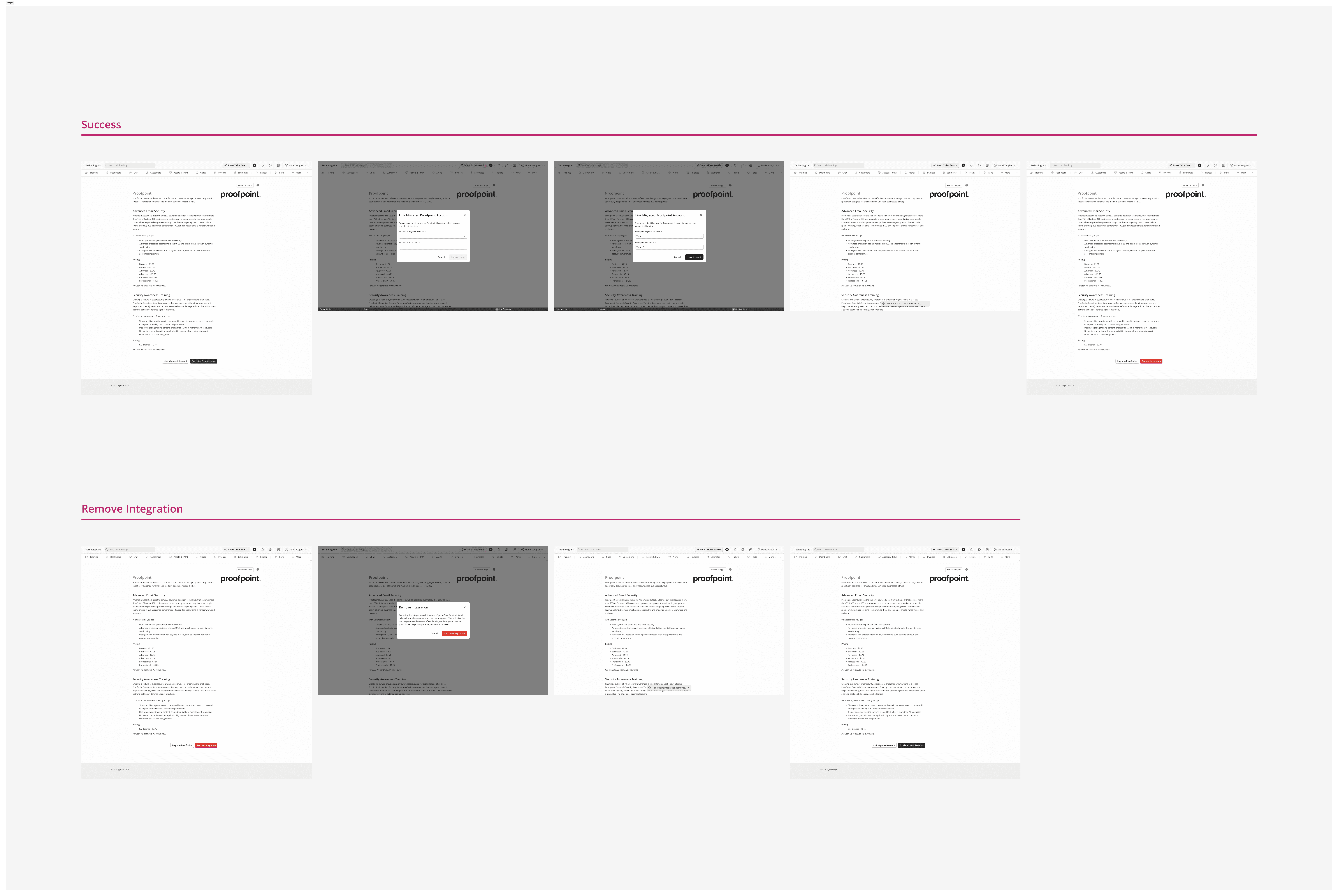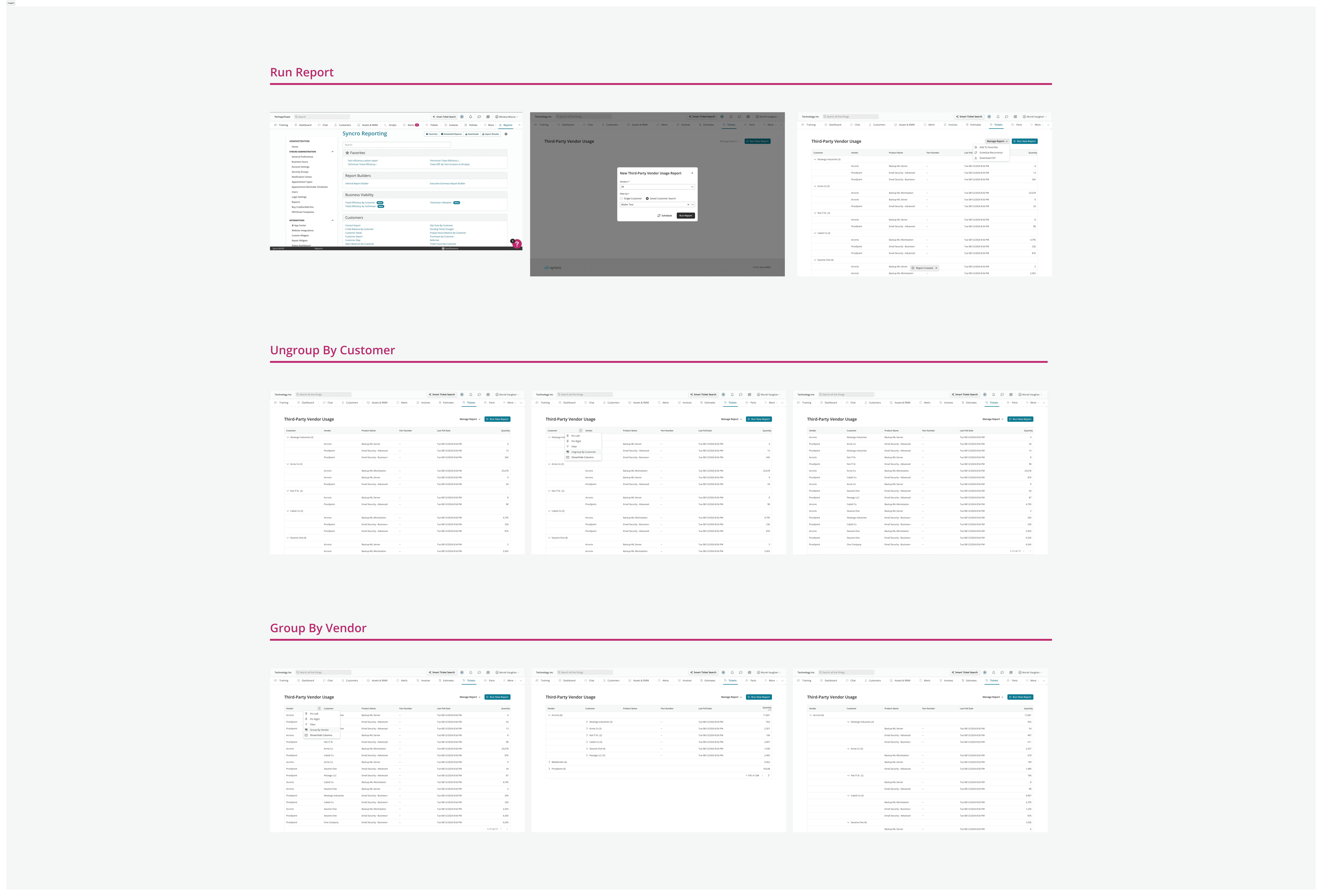 Universal Billing is a Syncro feature that automatically pulls daily license counts from third-party vendors and maps them to customer records, so billing admins never have to manually count and enter licenses again. I designed the end-to-end experience, including the Customer Mapping Tool, the Vendor Usage Report, and the recurring invoice integration, shipping first with Proofpoint and building the foundation for all future vendor support across the Syncro marketplace.